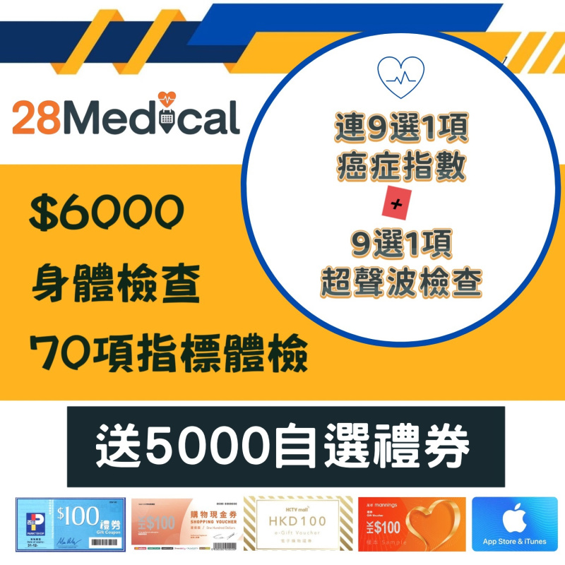 $6000身體檢查-全面70項指標體檢(9選1癌症指數+9選1超聲波檢查)(送5000禮券)