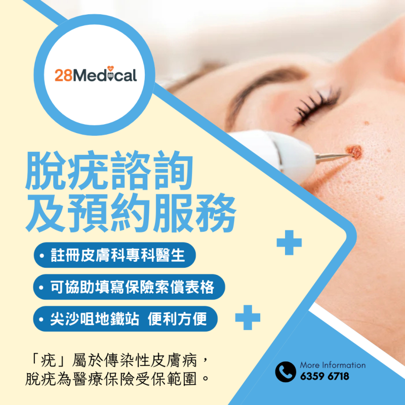由於「疣」屬於傳染性皮膚病,脫疣屬醫療項目,可納入醫療保險受保範圍。我們提供專業脫疣服務,由註冊皮膚科專科醫生主理,確保過程安全可靠。我們亦協助客戶填寫保險索償表格,讓你可更輕鬆地處理理賠程序。